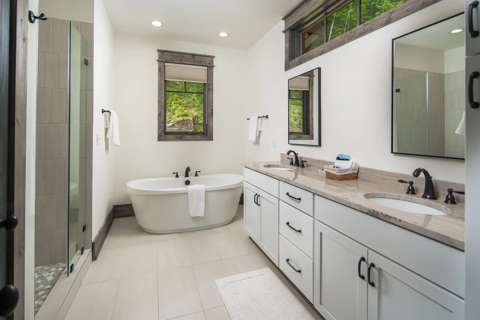 Modern bathroom with double vanity, large mirror, bathtub, walk-in shower, and windows showing greenery outside.