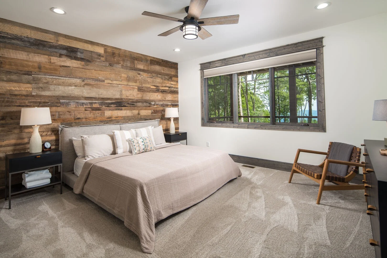 A bedroom with a rustic wooden accent wall, a large window with a view of trees, a bed with beige bedding, two nightstands with lamps, a chair, and a ceiling fan.