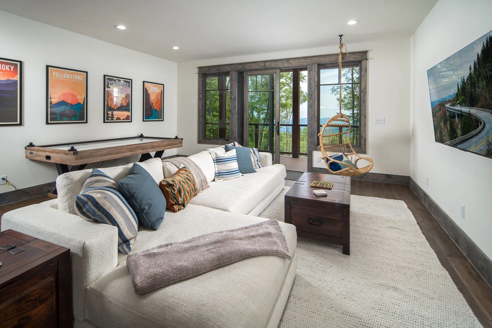 Living room with window view of trees and mountains, featuring a beige couch with decorative pillows, a wooden coffee table, hanging swinging chair, wall-mounted TV showing a mountain landscape, and framed nature posters on the wall.