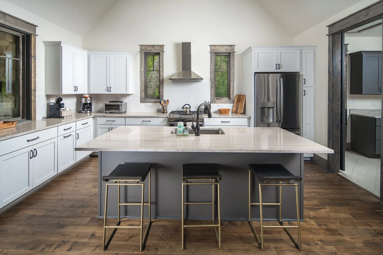 Modern kitchen with white cabinets, stainless steel appliances, a large island with a marble countertop, and three black barstools with gold legs, hardwood flooring, and two small windows above the stove.