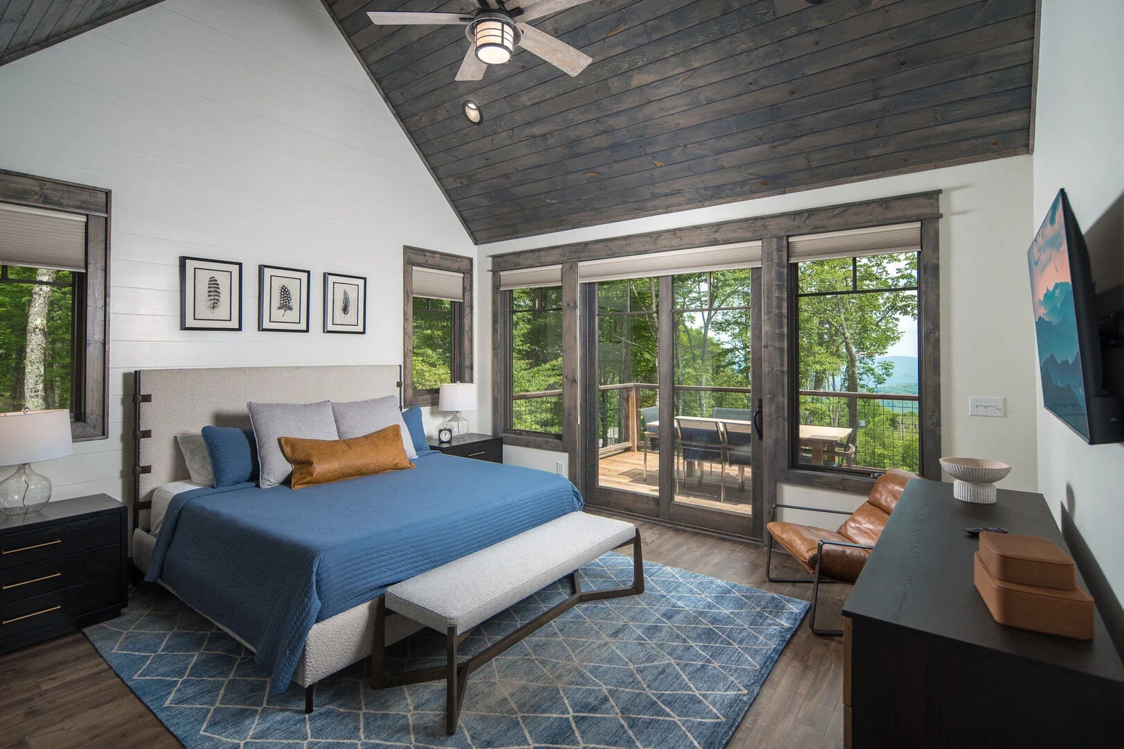 Bedroom with large windows and sliding doors opening to a balcony with trees in the background. The room features a bed with a blue quilt, throw pillows, nightstands with lamps, a leather chair, a dresser with decorative items, and artwork on the wal
